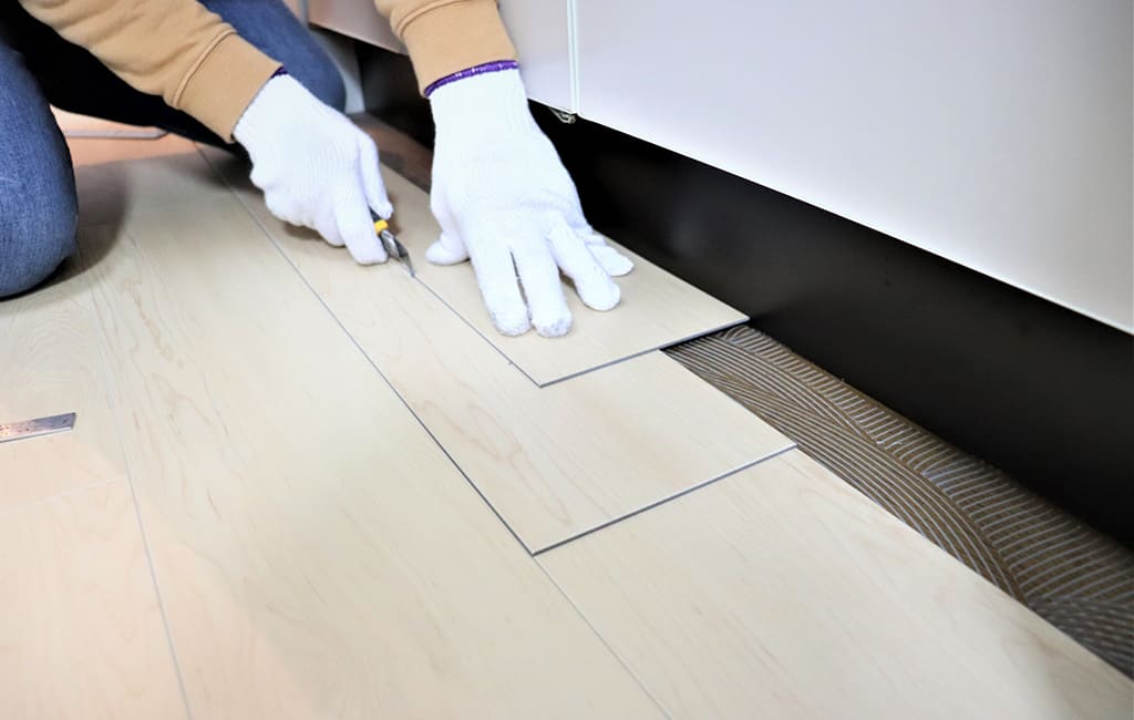 既存の床材を撤去した後、下地の状態を確認し、傷みや段差がある場合は補修して平らに整え、下地が整ったらフローリング、クッションフロア、フロアタイル、カーペットなど選択した床材を正確に張り込みます。